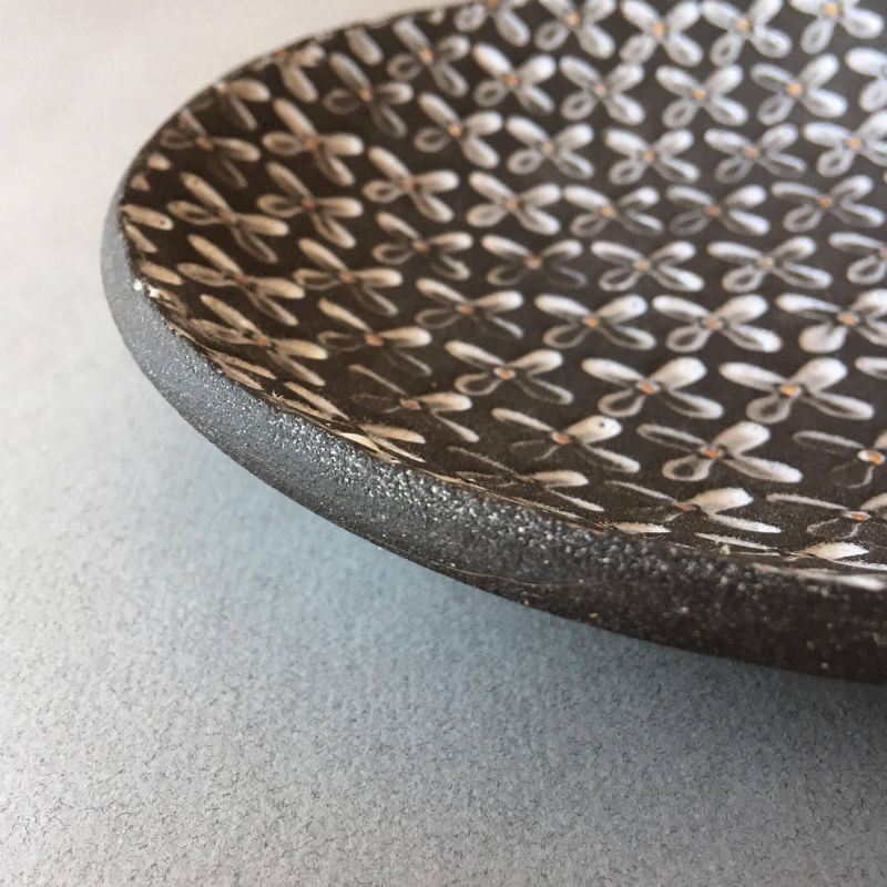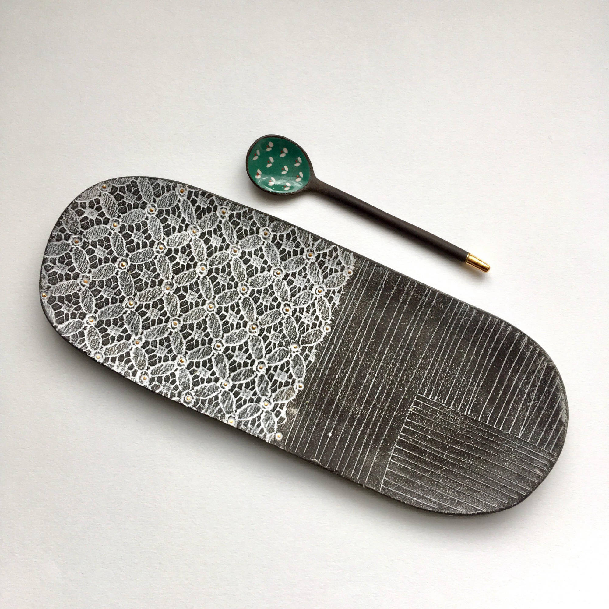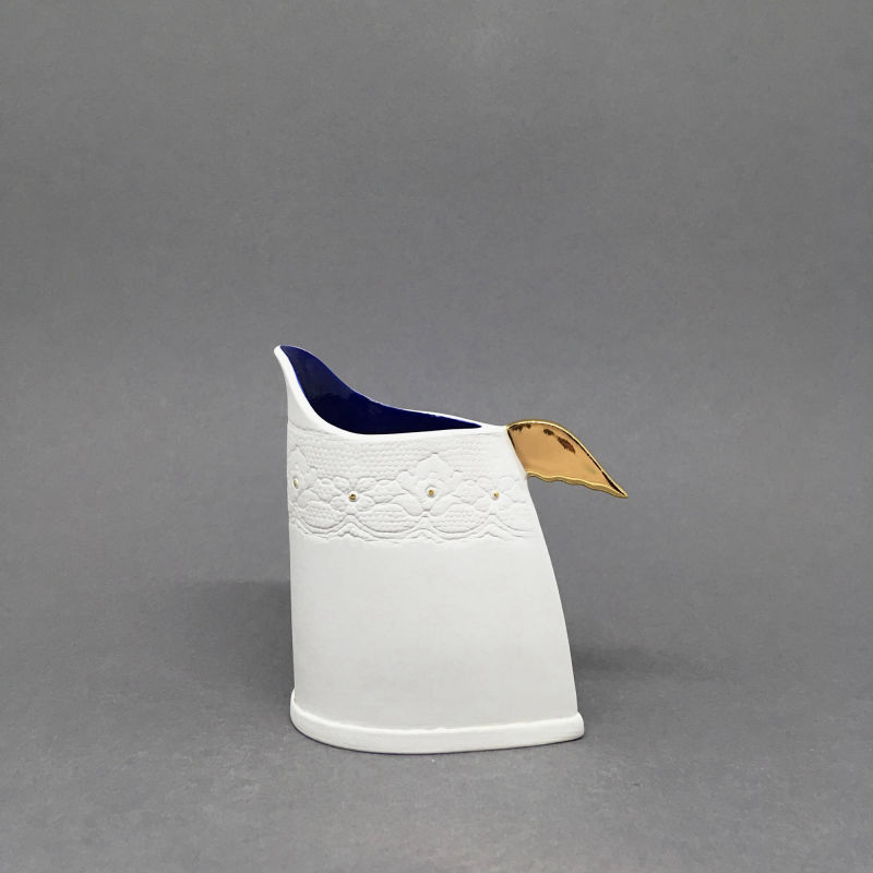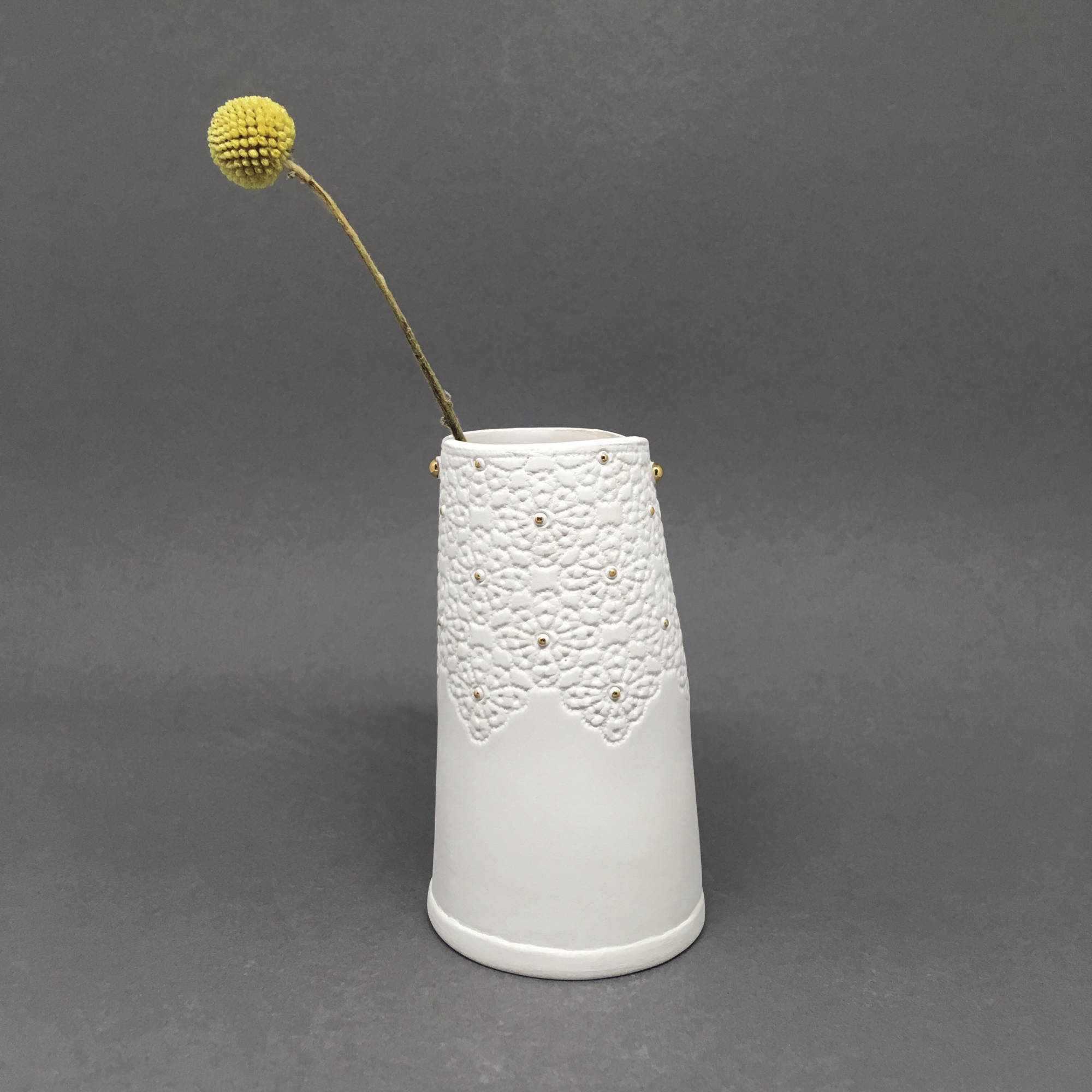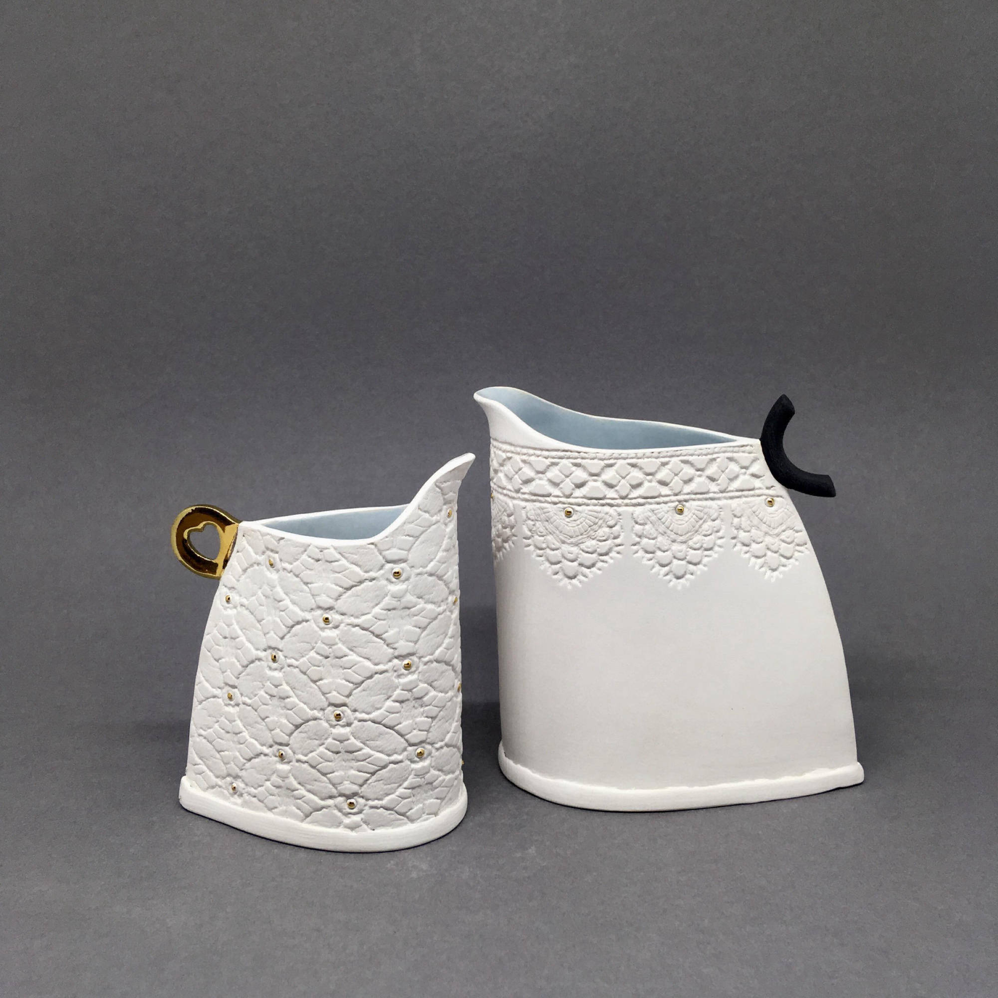 Working from a summerhouse in my garden, my pots are handmade from slabs of white and black earthenware clay. My ceramic career started when I hand modelled figures and animals, a technique that I still use today as added detail on certain pieces. Often decorated with subtle colours and patterns, delicate lace is impressed onto the surface of the clay to create beautifully textured marks.