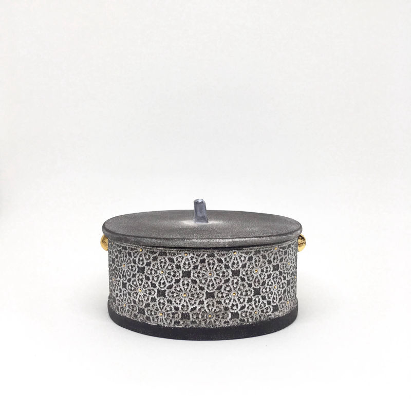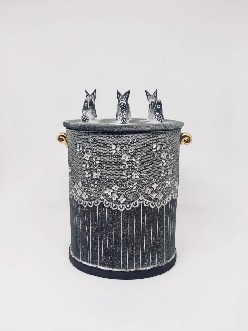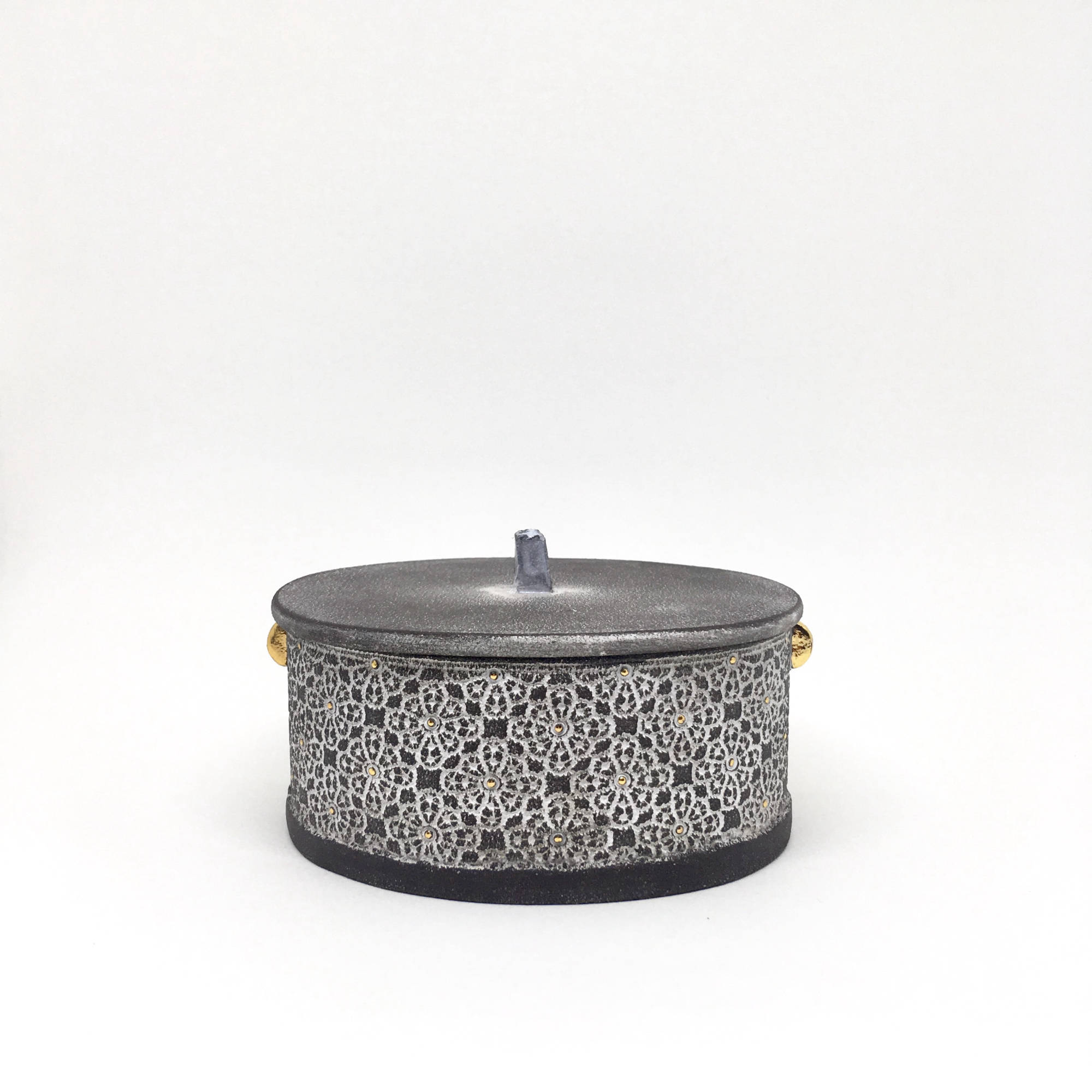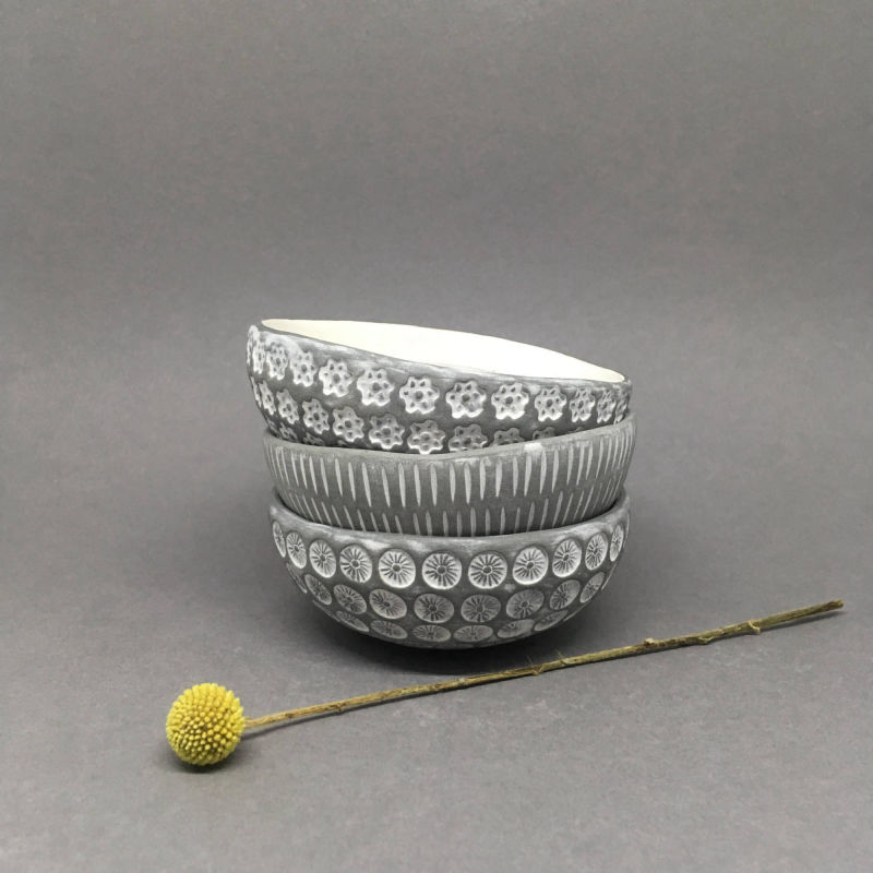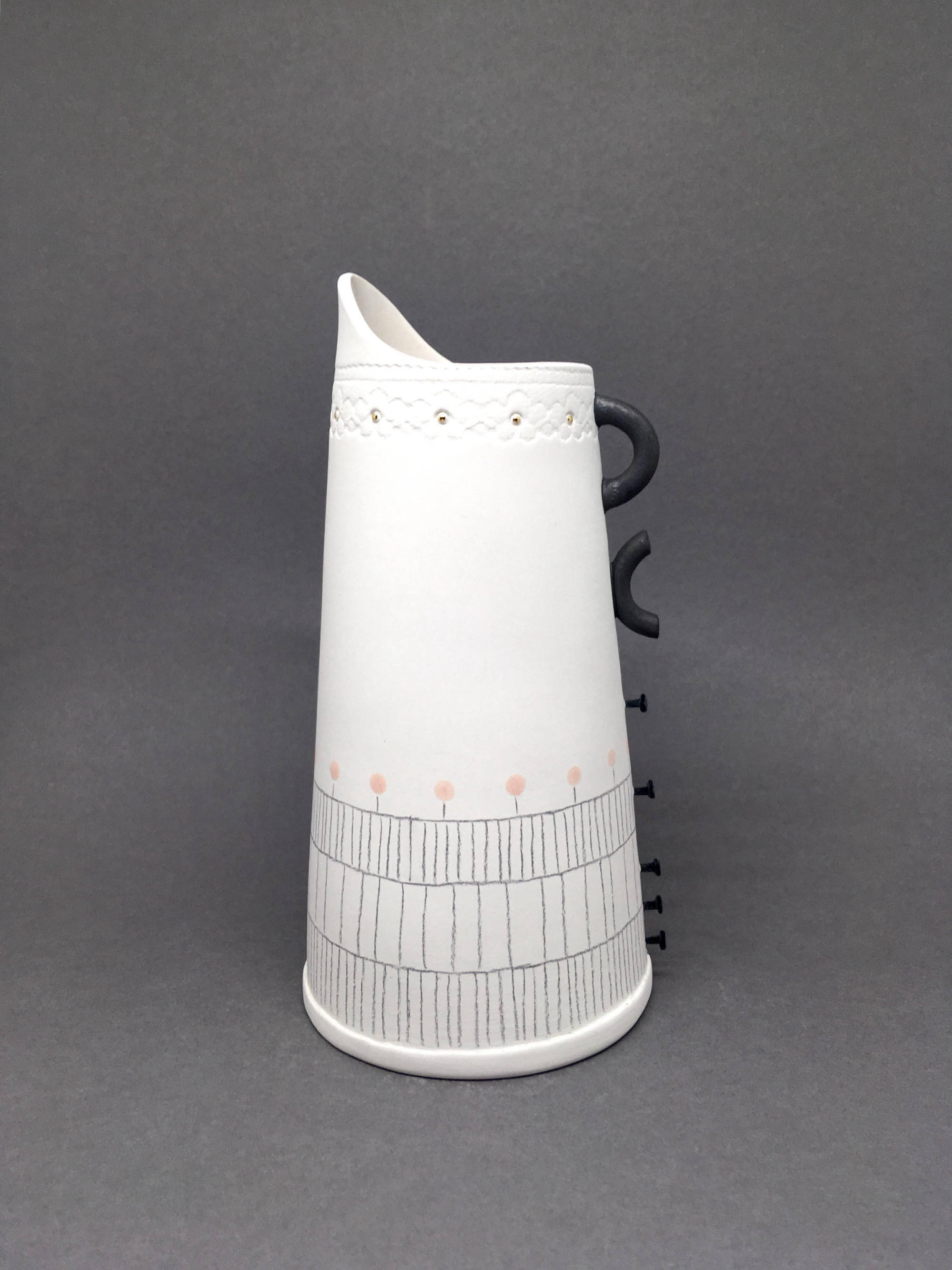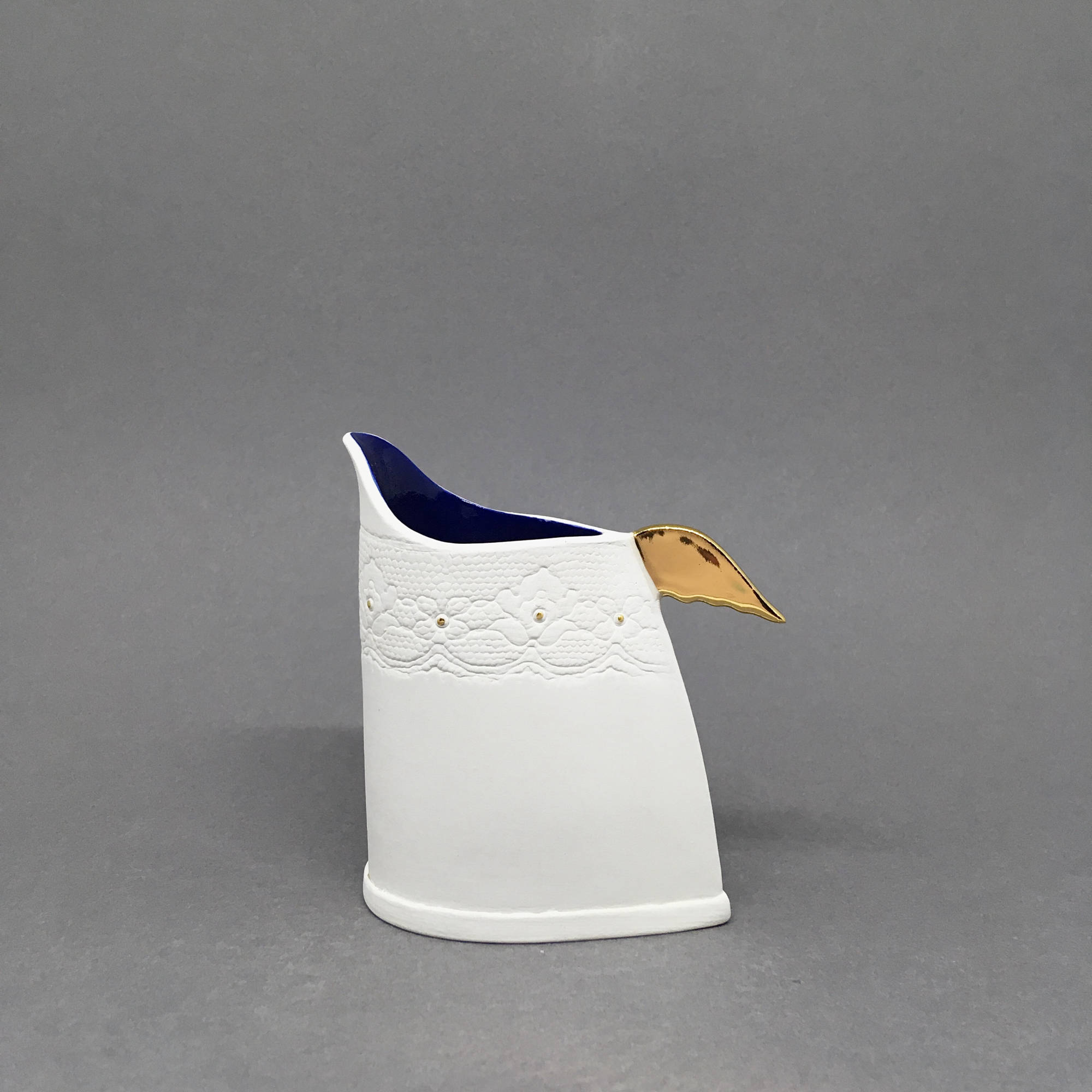 Working from a summerhouse in my garden, my pots are handmade from slabs of white and black earthenware clay. My ceramic career started when I hand modelled figures and animals, a technique that I still use today as added detail on certain pieces. Often decorated with subtle colours and patterns, delicate lace is impressed onto the surface of the clay to create beautifully textured marks.